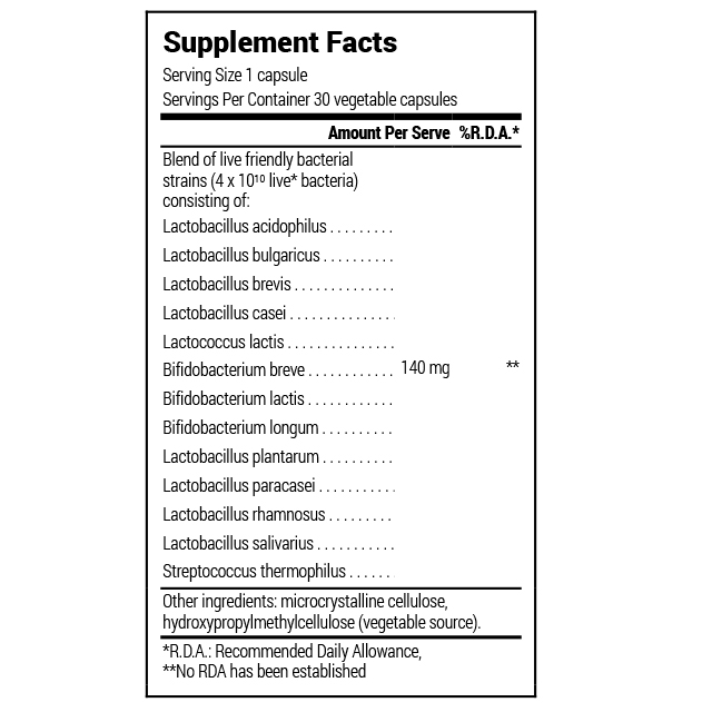 Este formulat pentru a crește diversitatea bacteriilor benefice și oferă treisprezece tulpini diferite de bacterii vii. Probioticele reduc, de asemenea, prezența bacteriilor patogene care pot afecta negativ intestinul.