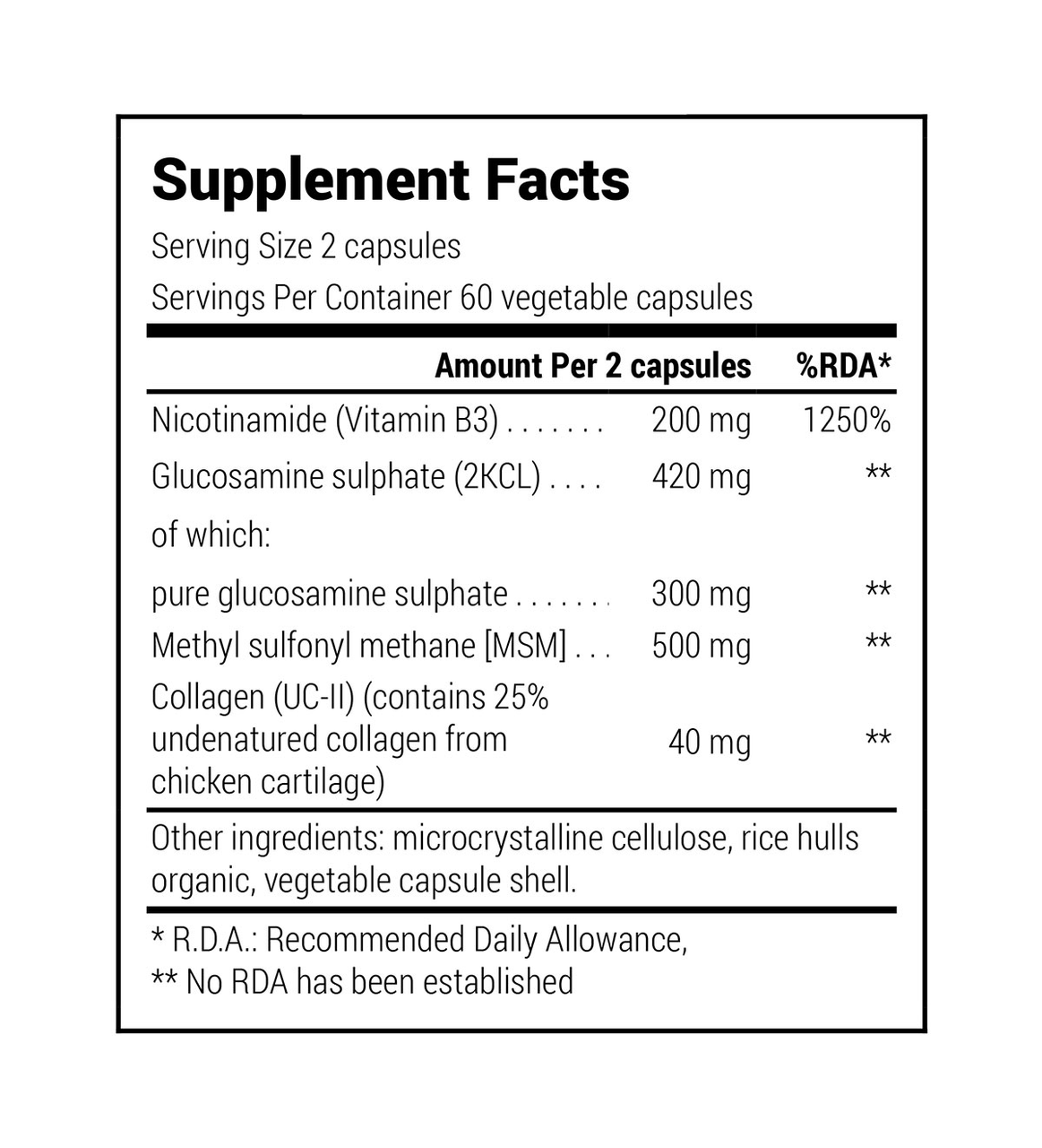 De asemenea, conține nicotinamidă, care contribuie la funcționarea normală a proceselor metabolice destinate producției de energie, cum ar fi producția și secreția de substanțe intercelulare (glicozaminoglicani, colagen, proteine non-colagenice) de către condrocite, susținând astfel sănătatea oaselor și articulațiilor.